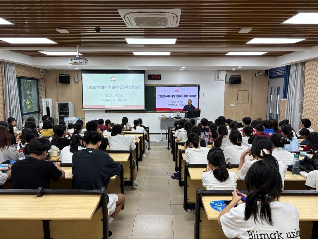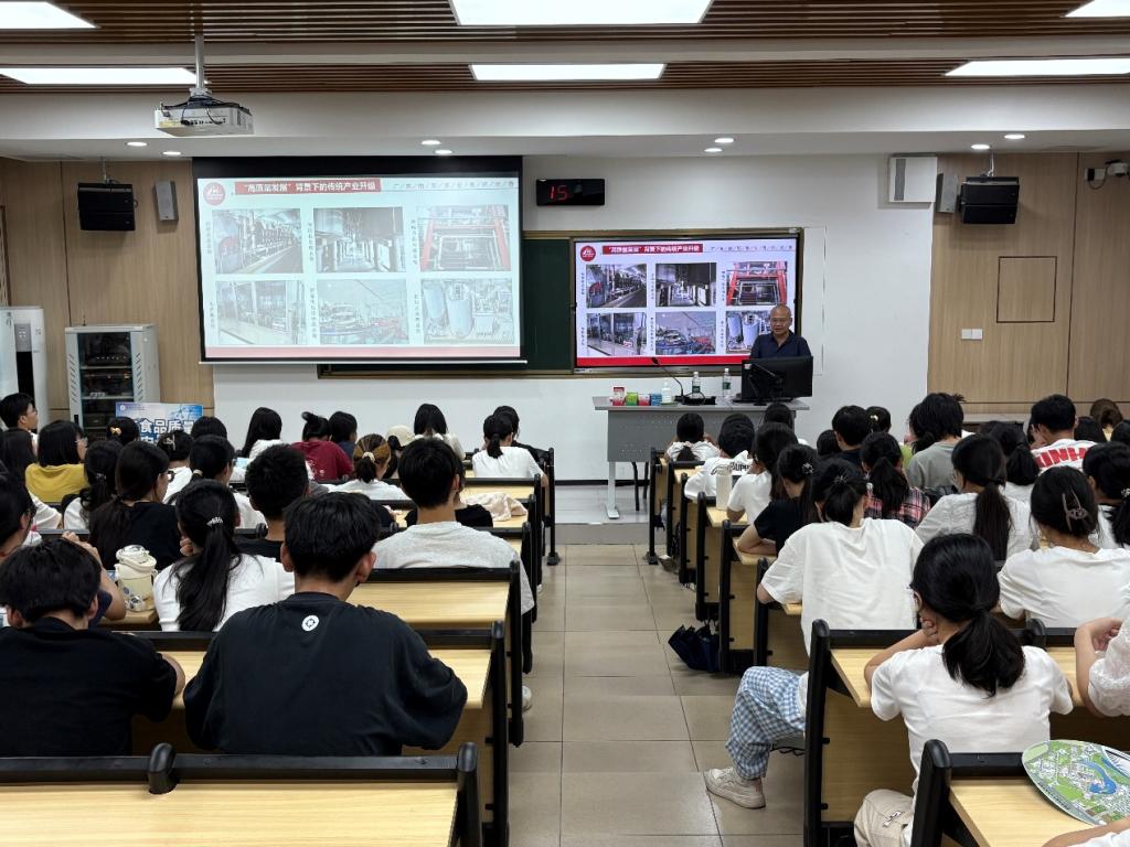 2025年9月14日下午,太阳网集团tcy8722迎来一位特殊嘉宾:食品质量与安全国家级职业教育教师教学创新团队成员、广东省九江酒厂有限公司副总经理、中国米酒研究院院长何松贵,为2025级食品质量与安全专业新生带来《工匠精神和科学精神促进技术创新》专题讲座。这位享受国务院特殊津贴专家、“九江双蒸酒酿制技艺”省级传承人、佛山市创新领军人才等多项荣誉的行业大师,以其三十年从业经历,向新生们展示了传统食品行业的创新蜕变。