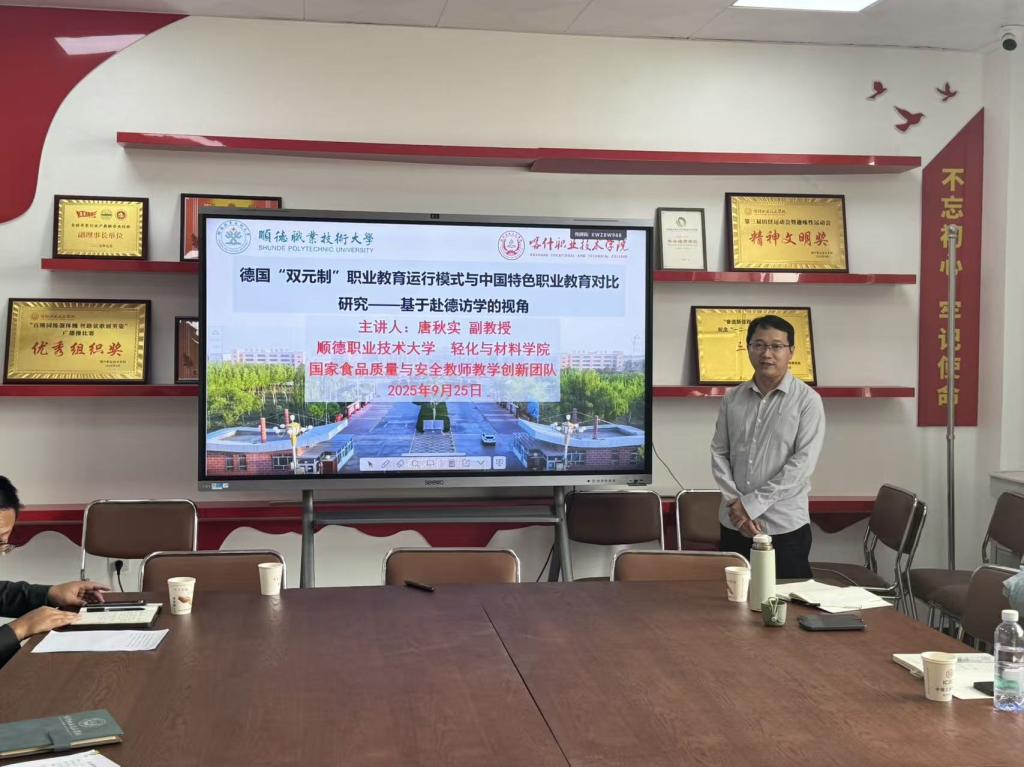 第二场讲座由小组团成员唐秋实副教授主讲。结合赴德国访学的经历,为与会人员带来关于德国双元制职业教育体系的分享。他深入讲解了德国双元制模式的组织形式,以及师资培养机制等内容,为在场教师提供了国际职业教育理念和模式参考。