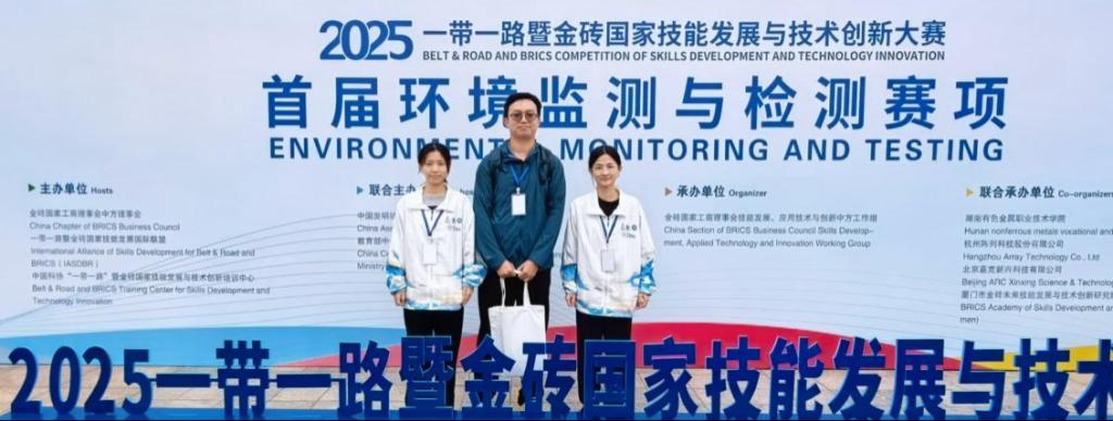 2025年10月19日,首届“一带一路暨金砖国家技能发展与技术创新大赛—环境监测与检测赛项”决赛在湖南有色金属职业技术学院顺利落下帷幕。我校太阳集团网址8722参赛选手郭丽冰、谢露同学(指导教师:靳小静、吴鹿鸣)凭借扎实的专业基础、出色的实践能力和默契的团队配合,在来自全国27个省(自治区、直辖市)89所院校的210名高职组选手中表现优异,最终荣获高职组银奖。