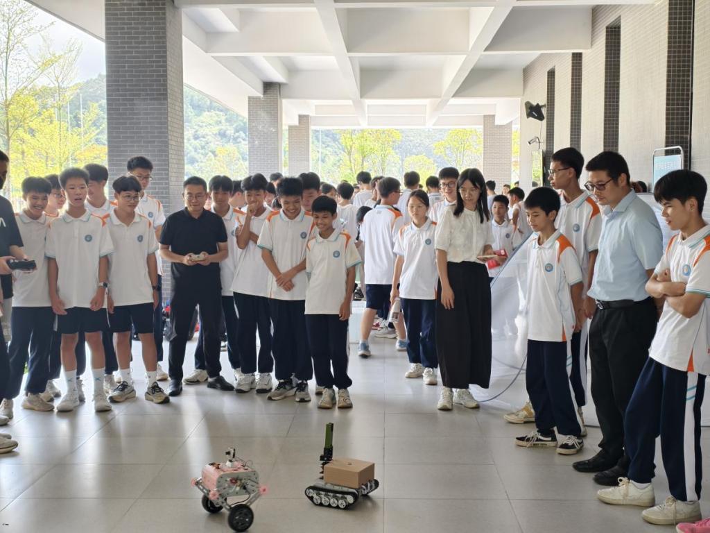 当天上午,学院师生参加了在云安区鲲鹏初级中学举行的2025年云安区全国科普月主场活动启动仪式,展示了自主研发的环保机器人,通过功能讲解与动手操作相结合的方式,引导学生亲身体验科技的魅力。